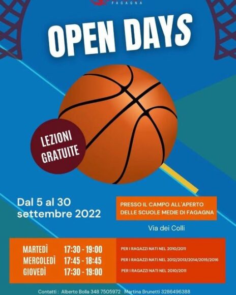 Al campo all’aperto delle scuole medie di Fagagna, in via dei Colli, sono aperte le iscrizioni per il minibasket 2022 – 2023 della Collinare Fagagna. Sino a fine mese, il martedì e il giovedì, dalle ore 17.30 alle 19, l’appuntamento è per i ragazzi e le ragazze nati nel 2010 e 2011, il mercoledì dalle pre 17.45 alle 18.45 per i nati e le nate dal 2012 al 2016. Contatti: Alberto Bolla 3487505972 e Martina Brunetti 3286496388.