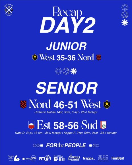 Nel primo incontro senior, è il West ad avere la meglio contro il Nord, privo di Gabriele Miani. Dopo una prima frazione di gioco in cui i giocatori di entrambe le squadre sembravano litigare con i ferri dei canestri, nel secondo tempo sono stati gli sceriffi ad aumentare i giri del motore trainati dalle ottime prestazioni di Umberto Nobile (14 punti, 5 rimbalzi e 3 assist) e Costantini. Il West così raddoppia nello scontro diretto tra vincenti nel primo turno.