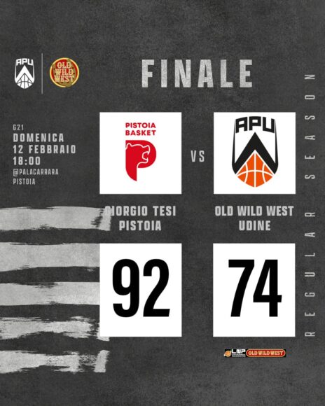 Giorgio Tesi Group Pistoia (34) – Old Wild West Apu Udine (26) 92-74 (31-13, 55-39, 72-56)