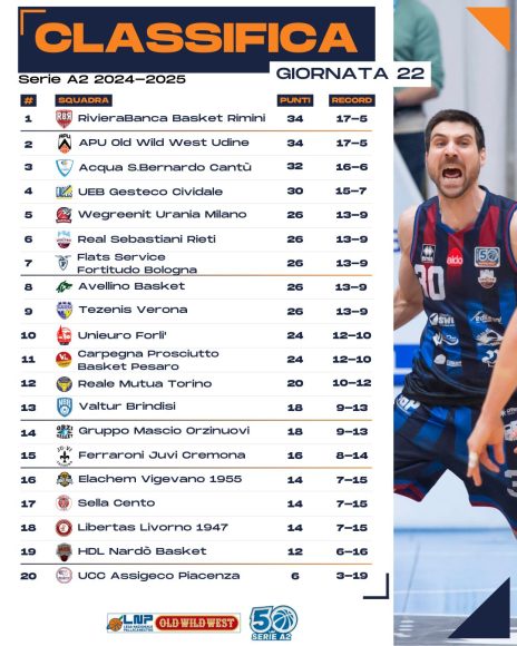 L’Apu tira la volata alle 6 squadre qualificate dritte ai quarti dei play-off a fine ritorno, tallonata da Cantù e con la Ueb quarta da sola a +4 su un quintetto di squadre aperto dall’Urania Milano dove Cividale ha perso all’andata e composto a seguire, nell’ordine, da Rieti prossima tappa sabato dei ducali, Fortitudo Bologna in risalita da quando è tornato coach Caja e chiuso dalla matricola terribile Avellino che, passata al supplementare al palaPerusini, è appena uscita dal giro play-off assieme a Verona.