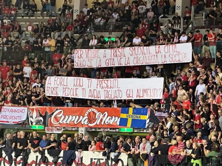(Nella foto di copertina, l’accoglienza ultrà domenica scorsa al palaRubini agli udinesi in trasferta)