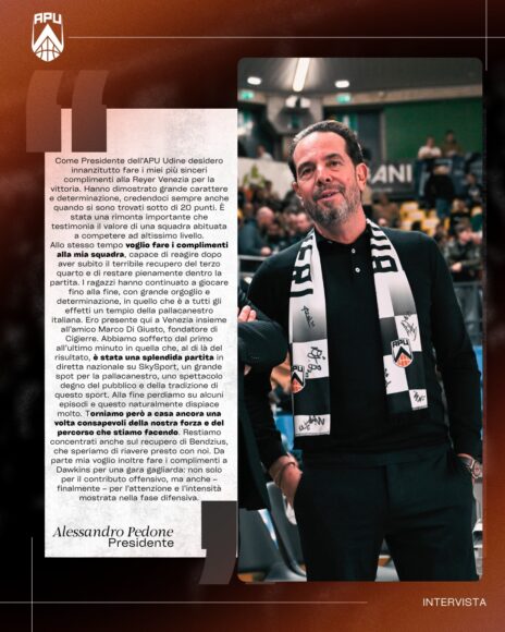 Apu Udine 𝙄𝙡 𝙋𝙧𝙚𝙨𝙞𝙙𝙚𝙣𝙩𝙚 𝘼𝙡𝙚𝙨𝙨𝙖𝙣𝙙𝙧𝙤 𝙋𝙚𝙙𝙤𝙣𝙚 𝙖𝙡 𝙩𝙚𝙧𝙢𝙞𝙣𝙚 𝙙𝙚𝙡 𝙢𝙖𝙩𝙘𝙝 𝙘𝙤𝙣𝙩𝙧𝙤 𝙑𝙚𝙣𝙚𝙯𝙞𝙖: <𝙀̀’ 𝙨𝙩𝙖𝙩𝙖 𝙪𝙣𝙖 𝙨𝙥𝙡𝙚𝙣𝙙𝙞𝙙𝙖 𝙥𝙖𝙧𝙩𝙞𝙩𝙖, 𝙪𝙣 𝙜𝙧𝙖𝙣𝙙𝙚 𝙨𝙥𝙤𝙩 𝙥𝙚𝙧 𝙡𝙖 𝙥𝙖𝙡𝙡𝙖𝙘𝙖𝙣𝙚𝙨𝙩𝙧𝙤> <Come Presidente dell’APU Basket desidero innanzitutto fare i miei più sinceri complimenti alla Reyer Venezia per la