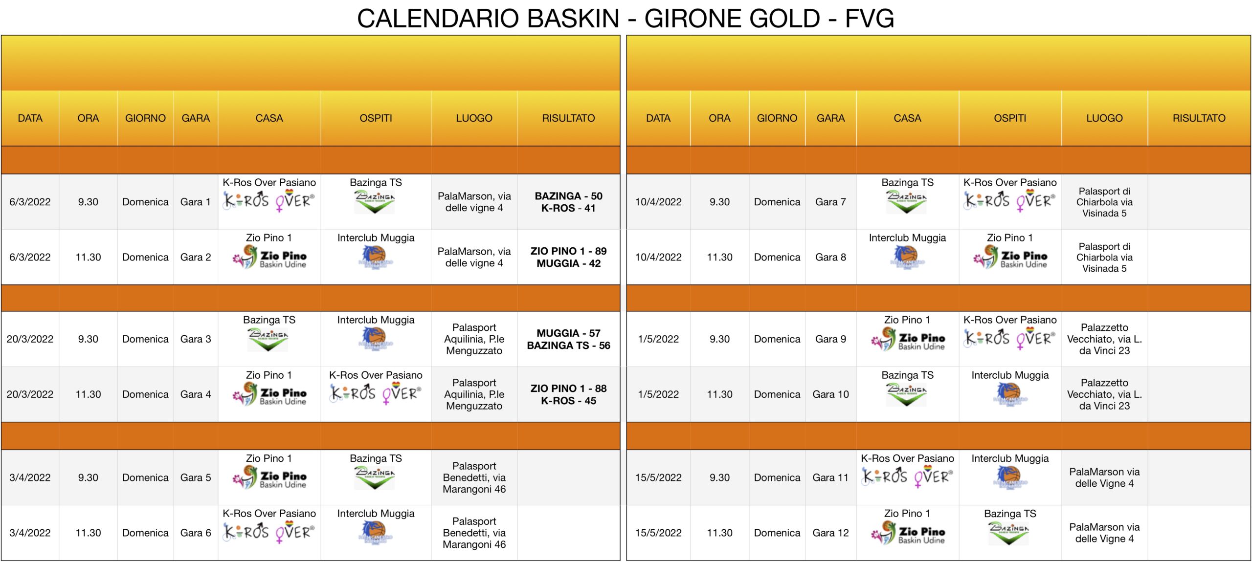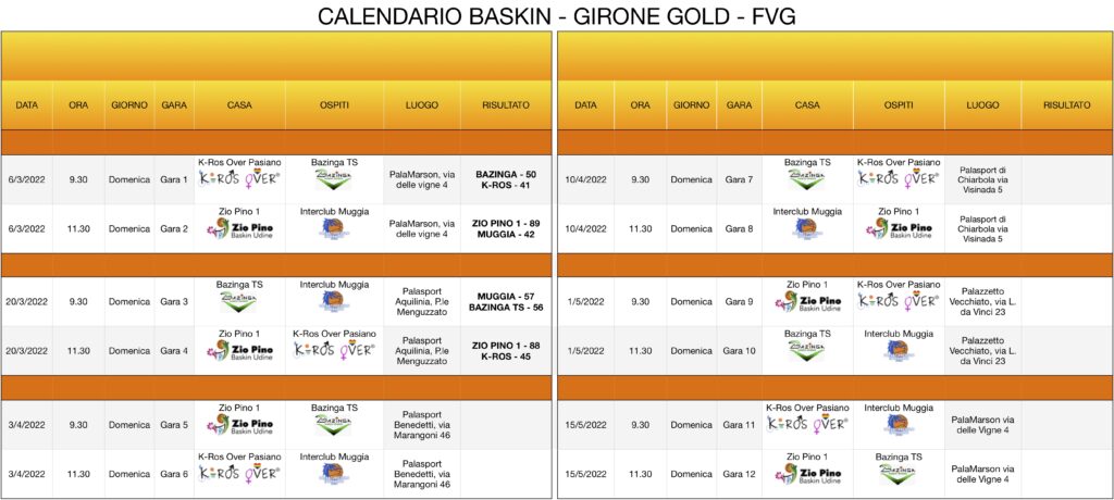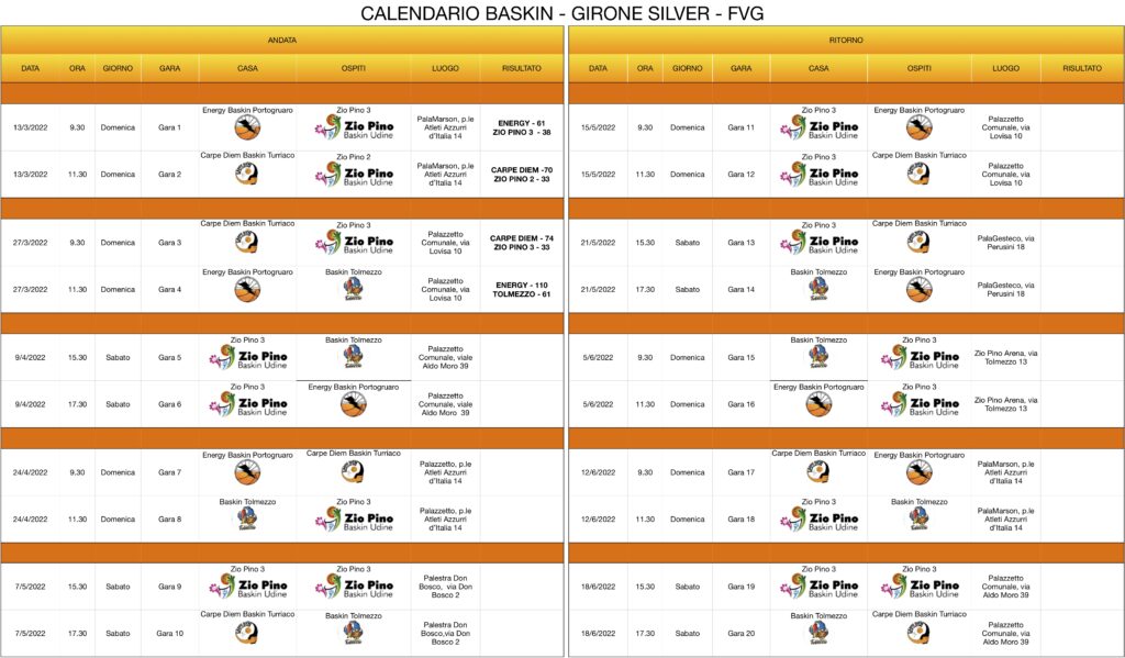 Il girone Silver, come anticipato, riprenderà sabato 9 aprile al palazzetto di via Aldo Moro 49 a Tolmezzo. Alle 15.30 è in programma Zio Pino 3 – Tolmezzo, alle 17.30 Zio Pino 2 – Portogruaro, a riposo Carpe Diem. Il campionato finirà sabato 18 giugno e si articolerà in dieci giornate, cinque di andata e altrettante di ritorno, con una squadra a riposo in ogni turno perché è a partecipazione dispari. Si giocherà due volte a Turriaco, Portogruaro, Tolmezzo (la seconda per la chiusura stagionale della categoria) e Udine. Qui la prima volta si giocherà l’ultima di andata alla palestra Don Bosco dell’Istituto Bearzi, dov’è nato il Baskin in Fvg, e l’altra domenica 5 giugno alla Zio Pino Arena all’aperto inaugurata l’estate scorsa a Tavagnacco. Un turno a testa ospiteranno Cormons, la quarta di andata, e Cividale del Friuli, la seconda di ritorno, dov’è in atto opera di sensibilizzazione.