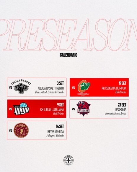 Pallacanestro Trieste ha definito il programma delle partite amichevoli che accompagneranno la preparazione della squadra in vista della prossima stagione di Serie A 2025-2026. L’obiettivo è quello di arrivare al debutto ufficiale del 5 ottobre con il giusto ritmo gara e una solida base tecnica e fisica.