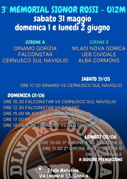 Prende il via sabato la terza edizione del “Memorial Signor Rossi” riservato agli Under 12 e organizzato dalla Dinamo Gorizia per ricordare la “mitologica” figura del “Signor Rossi” figura di riferimento alla Stella Matutina per generazioni di ragazze e ragazzi. Si inizia alle 17 con la sfida tra Dinamo e Cernusco sul Naviglio. Oltre ai padroni di casa e al team lombardo vi prendono parte anche Falconstar Monfalcone, Mladi Nova Gorica, Ueb Cividale e Alba Cormòns divisi in due gironi da tre squadre. Nell’immagine di copertina il programma completo del torneo che si concluderà lunedì 2 giugno.