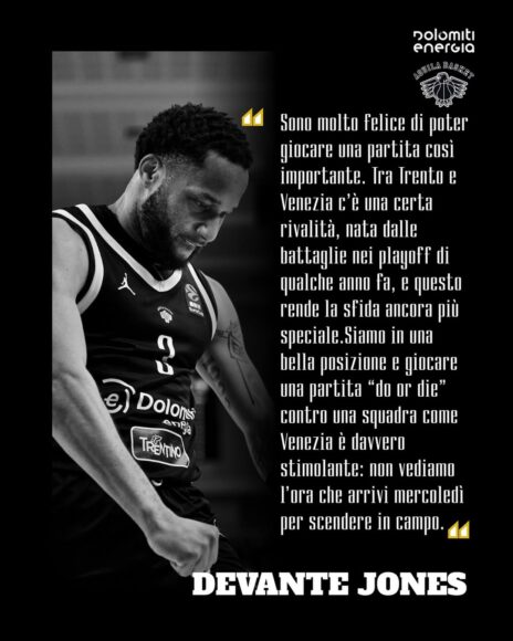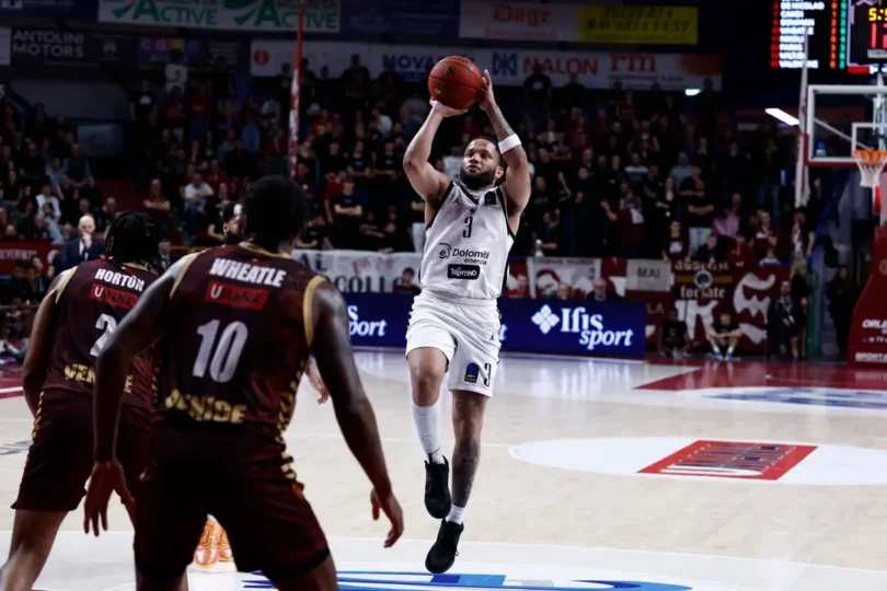 La Dolomiti Energia Trento vince un bellissimo derby di Eurocup contro l’Umana Reyer Venezia con il punteggio finale di 90-94 dopo un tempo supplementare. I bianconeri sono stati guidati da un super DeVante Jones, autore di 38 punti (6/12 da