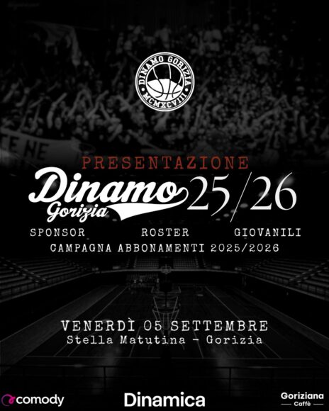 Venerdì 5 settembre la Dinamo Gorizia presenta ufficialmente la stagione 2025-2026 alla cittadinanza, a tutti i suoi appassionati ed encomiabili tifosi e agli addetti ai lavori. A partire dalle 18.30 alla Stella Matutina sfileranno sul „Black Carpet“ vecchi e nuovi giocatori del roster, con il nuovo capitano Colli in testa, che affronterà la seconda stagione di B interregionale, le compagini del settore giovanili e i partners economici che rendono possibile questa seconda avventura nella quarta serie nazionale. Verrà inoltre lanciata la campagna abbonamenti che prenderà il via nei prossimi giorni.
