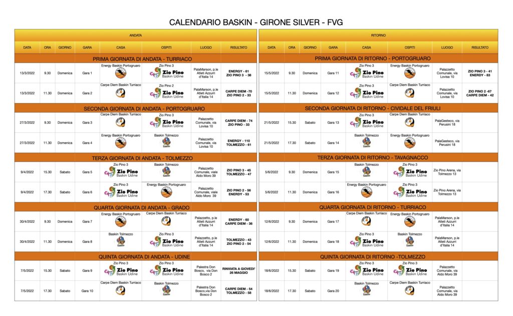 La Zio Pino 1 Udine è campione Fvg di baskin nel secondo campionato regionale, patrocinato dall’Ente italiano sport inclusivi (Eisi) e organizzato dalla sezione territoriale Baskin Friuli Venezia Giulia. Si è laureato vincendo tutte e cinque le partite giocate finora nel girone Gold a quattro squadre, l’ultima oggi a fine ritorno a Pasiano di Pordenone. Dopo il recupero della seconda di andata con i Bazinga Trieste domenica prossima a Lubiana, Zio Pino 1 sarà l’unica formazione Fvg ad accedere alla fase interregionale a tre squadre in programma domenica 5 giugno a Vigarano Mainarda (Ferrara) con la qualificazione per le finali nazionali in palio. Nella seconda categoria regionale Silver, oggi a Portogruaro, è cominciato il girone di ritorno con successi della capolista Energy, padrona di casa, e della Zio Pino 2 più immediata inseguitrice che deve recuperare il derby in famiglia con la Zio Pino 3, giovedì 26 maggio.