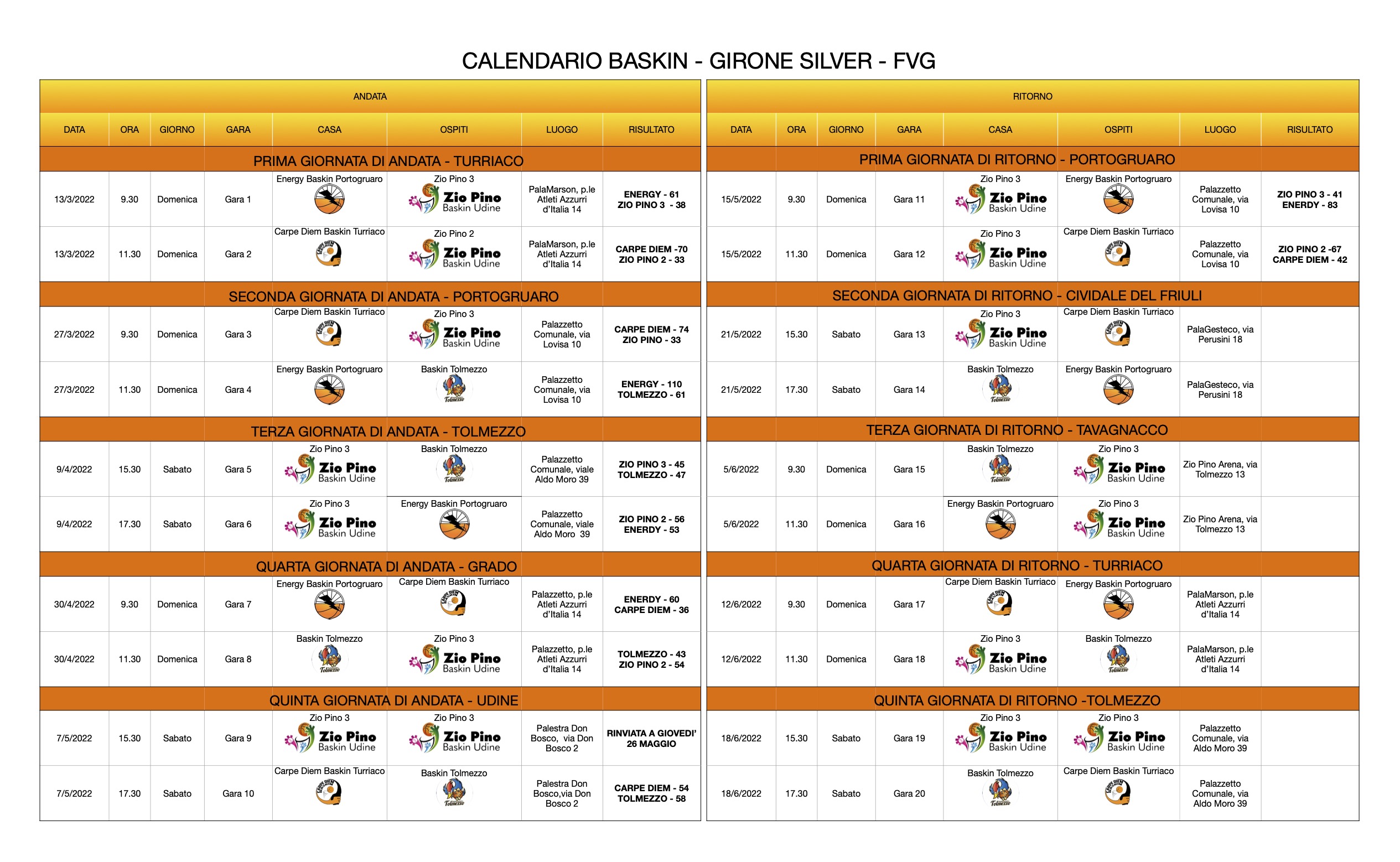 Classifica: Energy Portogruaro 13 punti; Zio Pino 2 Udine* 10; Carpe Diem Pieris-Turriaco Percorso Sicurezza 9; Tolmezzo 8; Zio Pino 3 Udine* 4; (ogni * una gara in meno, recupero il 26 maggio). Nel baskin si assegnano 3 punti a vittoria e uno alla squadra perdente.