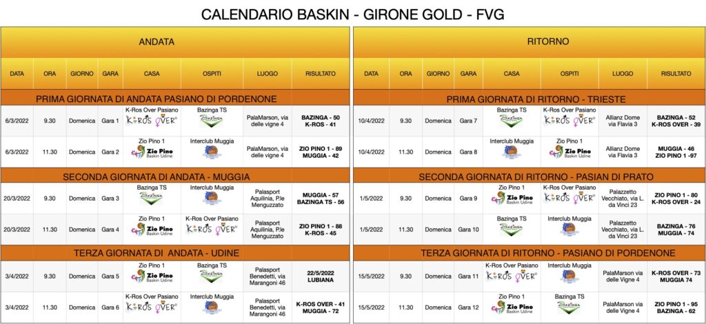 Classifica: Zio Pino 1 Udine* 15 punti; Interclub Muggia 12; Bazinga Trieste* 11; K-Ros Over Pasiano di Pordenone 6 (ogni * una gara in meno, da recuperare Zio Pino 1 – Bazinga domenica 22 maggio prossimo a Lubiana). Nel baskin si assegnano 3 punti alla squadra vincente e uno anche a quella perdente.