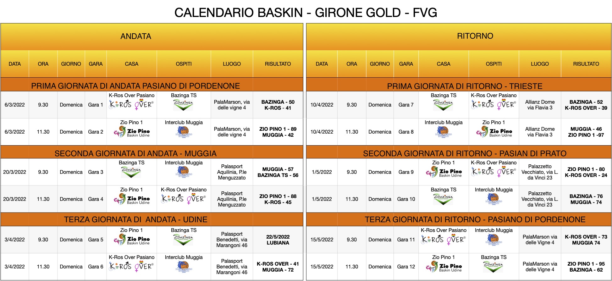 prima di ritorno a Trieste, Zio Pino 1 – Interclub 97-46 e Bazinga – K-Ros Over 52-39;