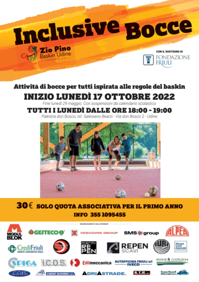 Intanto, oltre al Baskin, Zio Pino lunedì scorso ha fatto partire il corso di InclusivAfrodance con il ballerino e maestro Felix Sela, mentre da lunedì 17 ottobre inizierà l’attività di Inclusive Bocce. Entrambi i corsi si terranno alla palestra Don Bosco dell’istituto Berazi di via Don Bosco 2 a Udine ogni lunedì appunto dalla ore 18 alle 19 le bocce e dalle ore 10 alle 20 la danza. Ulteriore informazioni si possono avere al numero di cellulare 335 1095455.